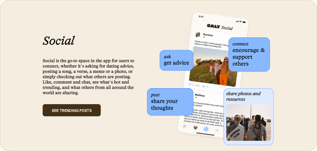 Finding your community, tribe, or like-minded people can be challenging today. That’s why Salt has developed Communities—your one-stop hub for connecting, growing, or praying with other followers of Christ just like you. I personally love this feature because it takes the pressure off “dating” and puts the focus back on building meaningful, Christ-centered connections.